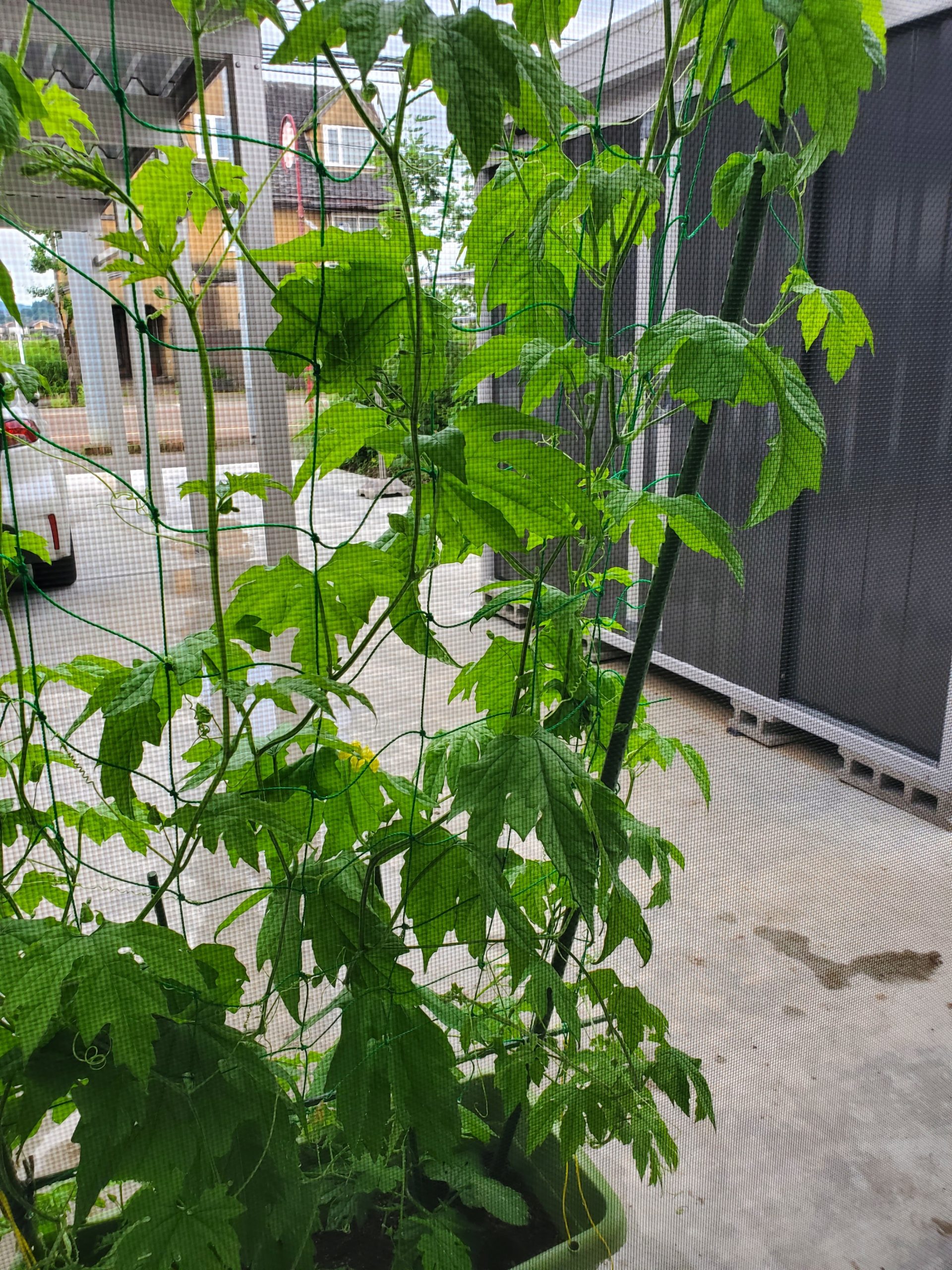 還暦おじさんは、毎朝の「ゴーヤパトロール」と称して、ツルの伸び具合をチェックし、ネットに絡ませる作業を楽しんでいます。